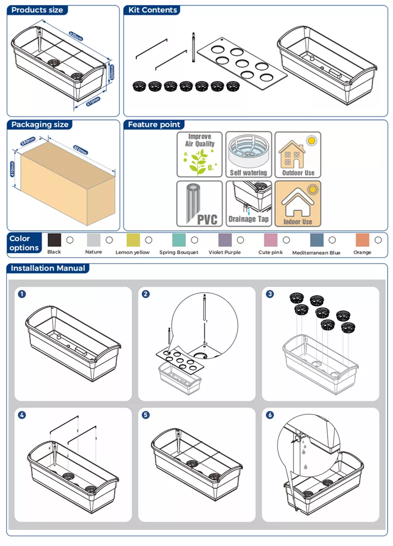 이 30L 자체 급수 대패는 야채, 녹색 식물 및 꽃 재배에 적합합니다. 수위를 모니터링하는 수위 게이지가 장착되어 있습니다. 수위가 최대값을 초과하면 냄비에서 물을 배수해야 합니다. 냄비 옆면에 배수 밸브가 있습니다. 안쪽으로 밀어서 닫고, 바깥쪽으로 당겨서 물을 빼냅니다. 이 냄비는 실내와 실외 모두에서 사용할 수 있습니다. 실외에서 사용할 경우, 비로 인해 냄비에 물이 고이는 것을 방지하기 위해 배수 밸브를 반드시 열어주세요.