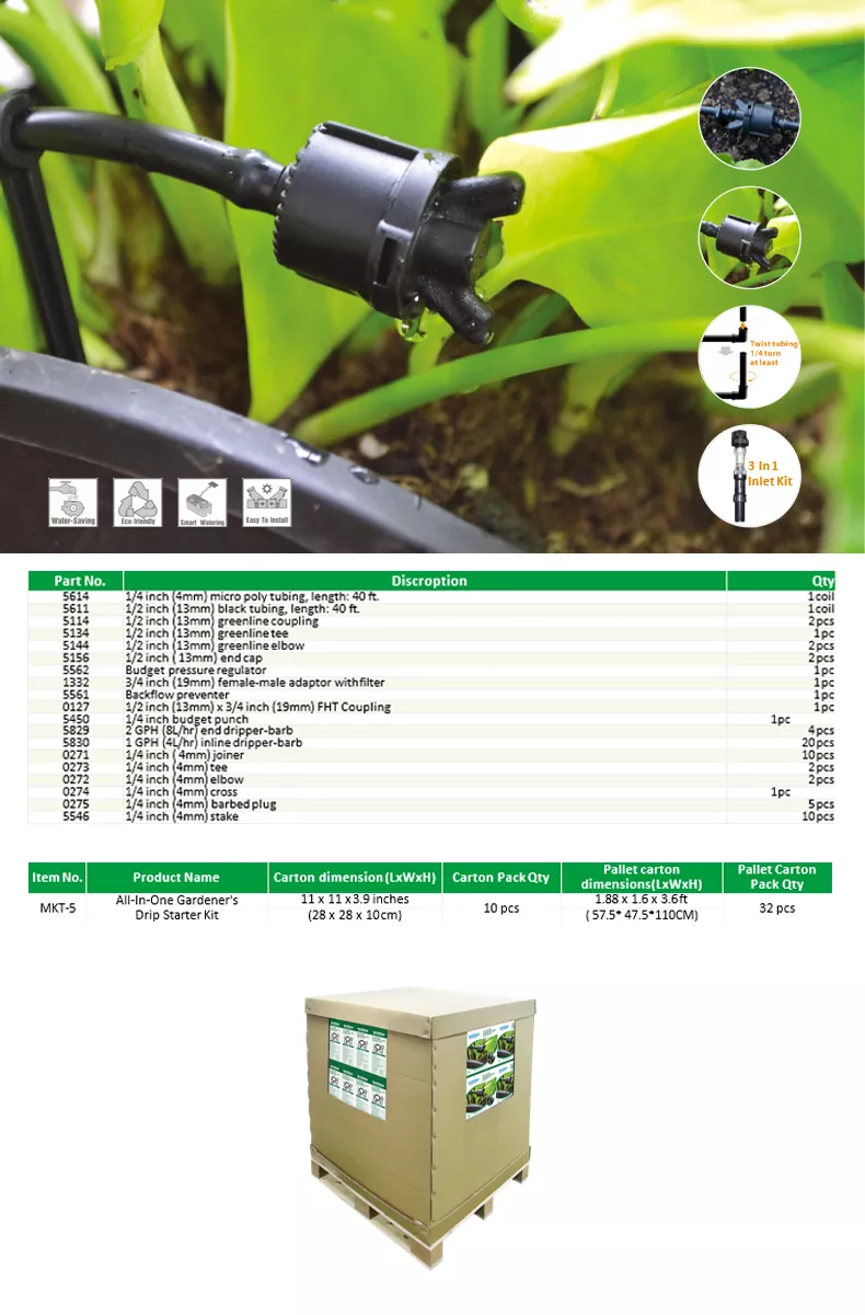 일체형 정원사 드립 스타터 키트는 자신만의 관개 시스템을 구축하는 데 도움이 되며, 드립 관개 키트는 농업, 원예 및 가정 원예 요구 사항을 위한 효율적이고 물을 절약하는 솔루션입니다. 식물 뿌리에 직접 물을 공급하여 폐기물을 최소화하고 식물 건강을 극대화합니다.
