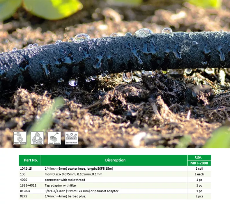 DIY 소커 호스 스타터 키트 MKT-2000 1, 효율적이고 편리한 급수를 쉽게 만듭니다. 당신의 정원을 위한 시스템 2, 담그는 호스는 최대 70% 더 많은 물을 절약하여 절약합니다. 당신은 돈을 벌고 우리의 천연 자원을 유지하는 데 도움이 됩니다 3, 담그는 호스 관개를 설정하는 데 필요한 모든 것을 포함합니다. 체계