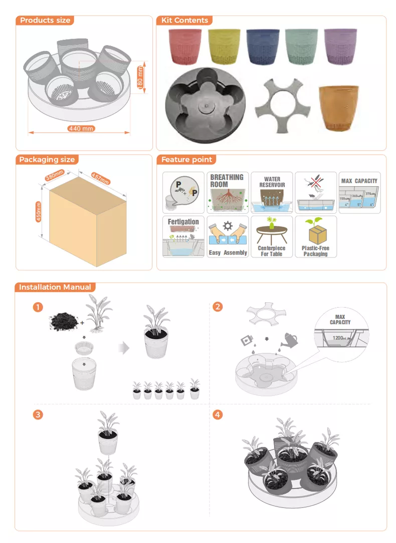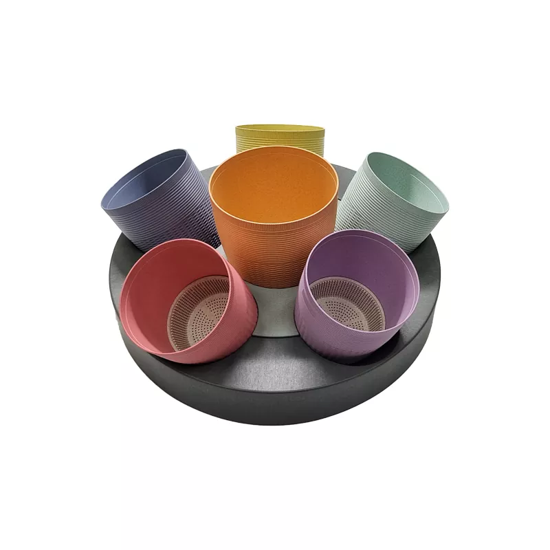 에코 가드닝 원형 화분 화분 구성 요소 세트는 통기성이 있는 바닥이 있는 화분 6개와 물 저장을 위한 원형 베이스로 구성됩니다. 그 중에는 5'' 화분 5개와 6'' 화분 1개가 있습니다.