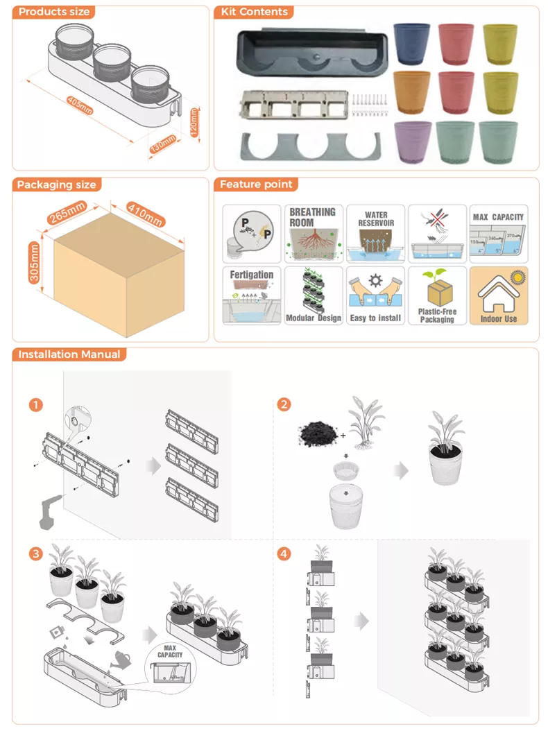 화분에 좋아하는 식물이나 야채를 심을 수 있습니다. 물주기도 매우 편리합니다. 물 저장 걸이 냄비에 물이나 영양 용액을 추가하면됩니다. 화분 바닥이 속이 빈 디자인으로 되어 있어 물을 더 잘 흡수할 수 있습니다.