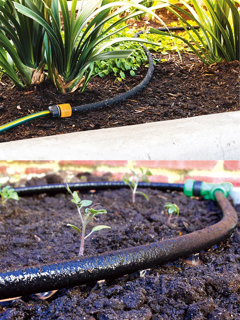 누출 호스 특성: 1, 미세 기공이 있는 거친 질감 – 호스 벽은 촉감이 거칠고, 수많은 미세한 기공이 있어 일관된 물 배출이 가능합니다. 2, 조정 가능한 흐름 제어 - 흐름 제한기(오리피스 플레이트)를 사용하여 물 출력을 조절할 수 있습니다. 3, 전체 길이 방출 - 전체 호스가 물을 고르게 방출하여 목표 관개를 위해 식물 뿌리 영역을 따라 직접 배치할 수 있습니다.