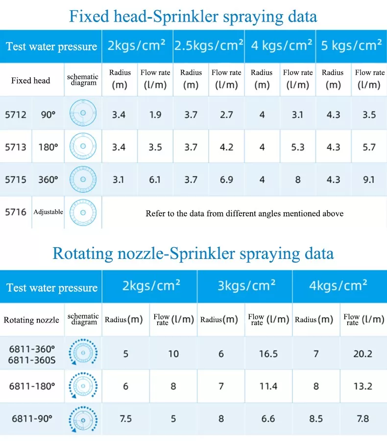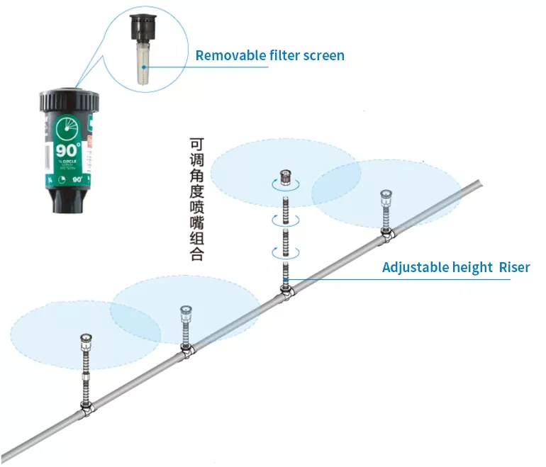 당사 제품에는 회전형과 고정형의 두 가지 유형의 스프링클러가 포함됩니다. 회전형 및 고정형 스프링클러는 모두 90°, 180°, 360° 등의 각도 옵션을 제공하며 사용자 정의 가능한 각도 실내 스프링클러와 함께 추가 장비를 구입할 필요 없이 고정 영역에서 유연한 조정, 작은 모서리 영역에서 넓은 전체 영역에 이르기까지 다양한 관개 시나리오의 요구 사항을 충족할 수 있습니다.