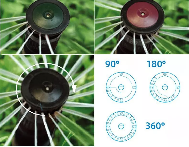 세 가지 회전식 스프링클러 옵션: 90°, 180°, 360° 이 잔디 급수 스프링클러는 최대 7.1m의 분사 거리로 뛰어난 바람 저항과 넓은 적용 범위를 제공합니다. 미세한 안개 같은 스프레이를 생성하여 넓은 잔디밭, 정원 및 이와 유사한 지역에 물을 공급하는 데 이상적입니다.