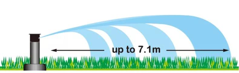 최대 분사 범위가 7.1미터인 회전식 스프링클러 헤드.