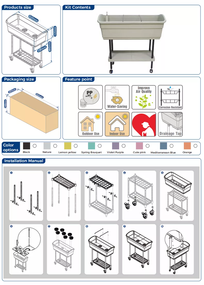 Mobile Elevated Garden Bed는 인체공학적 디자인 원칙을 준수하며, 특히 이동성 문제로 인해 쪼그려 앉는 데 어려움을 겪는 노인을 잘 배려합니다. 단일 레이어 스토리지 랙 디자인으로 꽃과 식물 재배에 필요한 모든 종류의 도구와 액세서리를 보관할 수 있습니다. 실내 및 실외 환경 모두에서 이동을 용이하게 하는 범용 바퀴가 장착되어 있습니다. 그것은 식물 심기를 좋아하는 도시에 사는 사람들의 요구를 잘 충족시킬 수 있습니다. 식물 재배를 위한 탁월한 환경을 제공하고 생태학적, 친환경적이며 건강한 라이프 스타일을 쉽게 만들 수 있도록 도와줍니다.