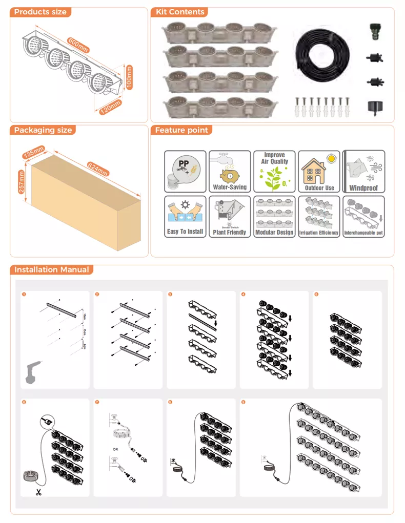 수직 정원 시작 키트는 Watex Professional Green Wall System을 사용하여 수직 정원을 구축하려는 주택 소유자를 위한 빠르고 쉬운 시작 키트입니다. 이 키트에는 매달린 줄무늬 4개, watex #8 냄비 4개, 내부 냄비 16개가 들어 있습니다.