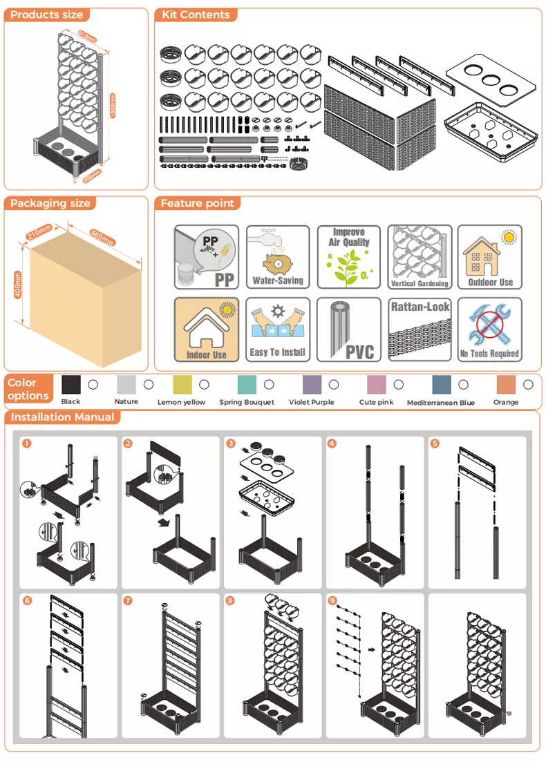 양상추와 방울토마토 같은 흔한 야채나 로즈마리와 민트 같은 허브, 다양한 모양과 화려한 꽃의 다육식물을 재배하고 싶다면 독립형 파티오 수직 정원이 완벽하게 수용할 수 있습니다. 자신의 취향에 따라 자유롭게 조합하고 매치할 수 있으며, 나만의 특별한 수직 정원을 손으로 만들 수 있으며, DIY 정원 가꾸기의 독특한 재미를 경험할 수 있습니다.