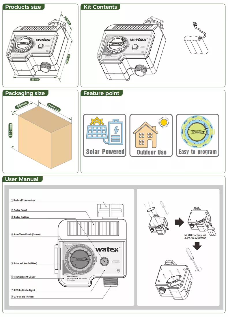 유사한 제품과 비교할 때 태양열 탭 타이머는 배터리를 자주 교체할 필요가 없습니다(정상 사용 시). 환경 친화적이고 에너지 효율적입니다. 충분한 파워와 내구성을 갖추고 있어 안심하고 출장 출장을 갈 수 있는 급수 장치입니다.
